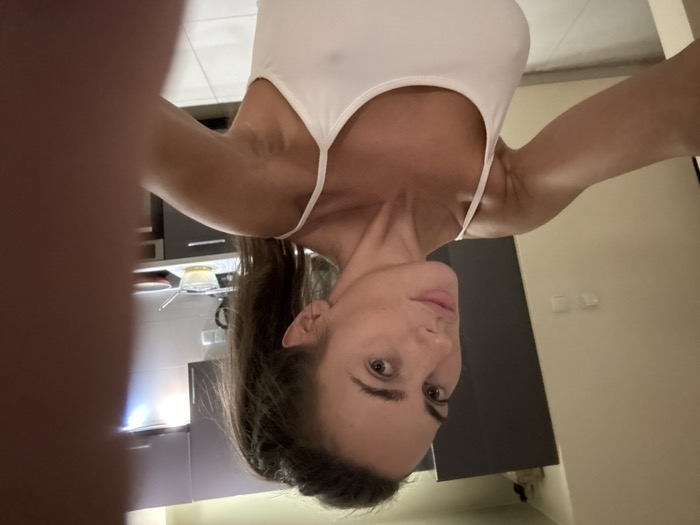 A woman in a white tank top poses, head tilted, for a selfie. A ponytail pulls her hair back. Kitchen cabinets and countertops with sink, and beige walls are in the background. The camera angle is high, looking down. Her right arm is visibly stretched out.