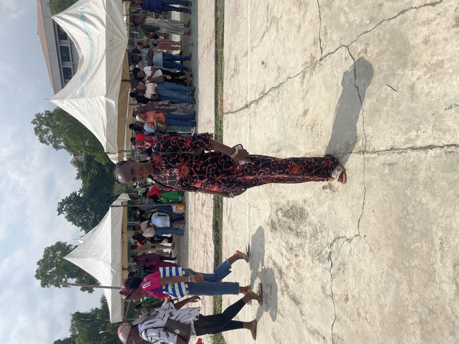The image depicts an outdoor gathering in Ebute-Metta, Nigeria, characterized by a cracked concrete ground under bright, partly cloudy skies