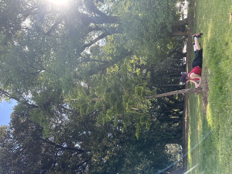 The image depicts a sunlit open-air park setting in Carlton, Australia. In the foreground, green grass is extensively visible. Slightly right of center, a slender, approximately 2.5-meter tall coniferous tree with compact green foliage stands upright. To the left of this tree, a person is lying prone on the grass, supported on their elbows, facing right. This individual has dark, shoulder-length hair and is dressed in a red sleeveless top, dark shorts or a skirt, and dark athletic shoes with white soles and pink stripes. They are holding and interacting with a dark-colored smartphone or small tablet with both hands. The background is densely populated with mature, broadleaf trees, creating a thick green canopy. Direct sunlight enters from the upper right, producing a prominent lens flare. In the far right background, partially obscured by tree trunks, a second individual is visible, seated or reclined on the ground. Distant vehicles and an unclear urban structure are faintly discernible through the trees on the far left. The sky, visible above the tree line, is clear blue.
