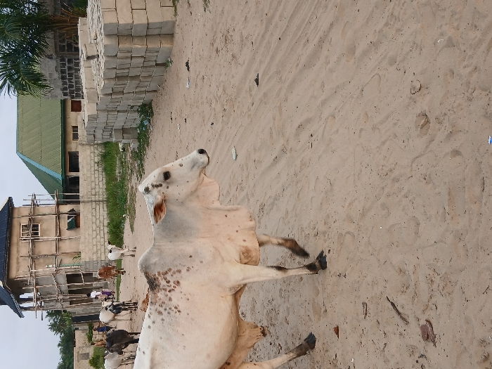 A white and gray spotted cow is in the foreground, with other cows visible in the background. These cows are near buildings, including one with scaffolding and another with a green roof. A stack of gray concrete blocks is also visible, with a sandy ground filling much of the frame.