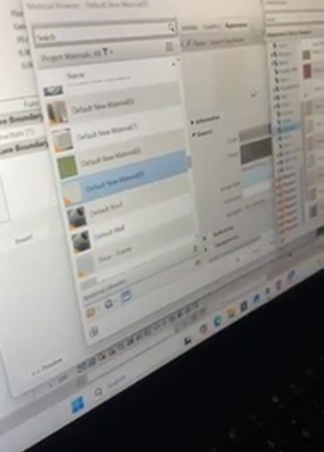 close-up of a laptop screen displaying the Autodesk Revit 2021 software. The "Material Browser" window is open, showing a list of "Project Materials: All". "Default New Material(9)" is highlighted. The "Appearance Library" window is also open, showing various material options. A child's voice is audible in the background. The laptop keyboard is visible in the foreground.