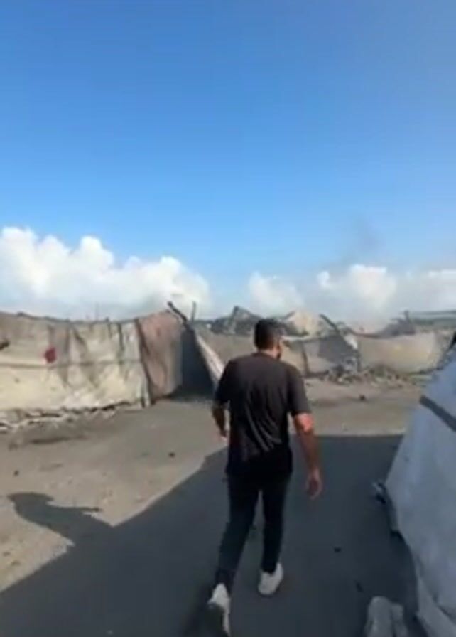 man walking through a desolate area. The ground appears to be dusty or covered in ash. There are several structures, possibly tents or temporary shelters, in various states of disrepair. Some appear burnt or collapsed. Smoke is visible in the background. The sky is blue with scattered clouds. The man is wearing a black t-shirt, dark pants, and white shoes. He is walking away from the camera.