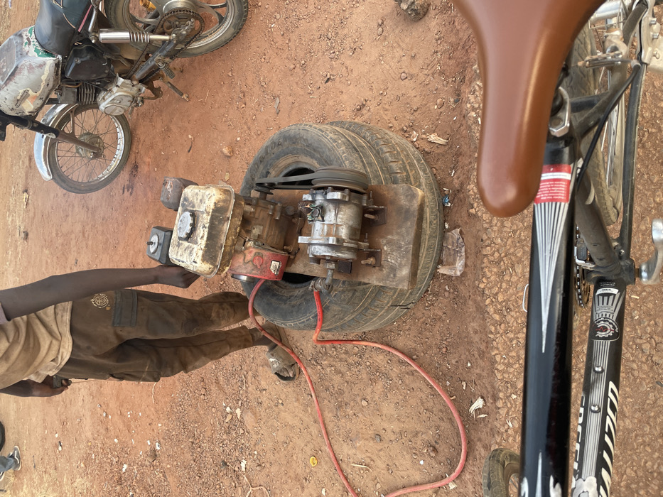 A person is standing in a reddish-brown, gravelly area next to a homemade air compressor. The air compressor is set on top of two stacked tires. The compressor is attached via a belt to a small engine. An orange air hose is connected to the compressor. Next to the compressor is a black bicycle with a brown seat, and in the background is a motorcycle.
