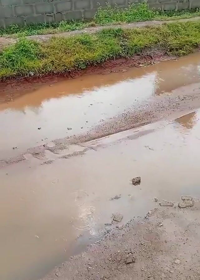 muddy road with large puddles of water, suggesting it has recently rained. The road surface is rough and uneven, with visible tire tracks and debris. A low brick wall runs along one side of the road, topped with grass. In the background, there's a building under construction with scaffolding. Raindrops create ripples on the water surface. The video seems to be taken from a stationary position.