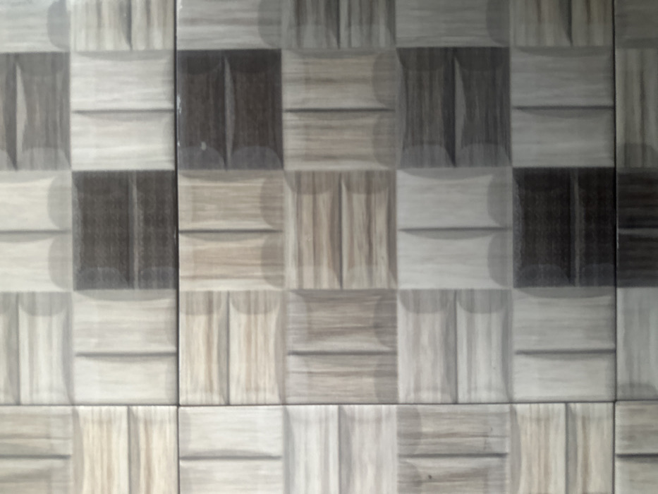 A repeating pattern of square tiles with a dimensional, textured surface. Each tile is divided into four rectangular segments, arranged in a square formation. The segments exhibit variations in shade, ranging from light gray/beige to dark brown. The overall effect is a mosaic-like design with a subtle 3D appearance. There are grout lines between each tile.