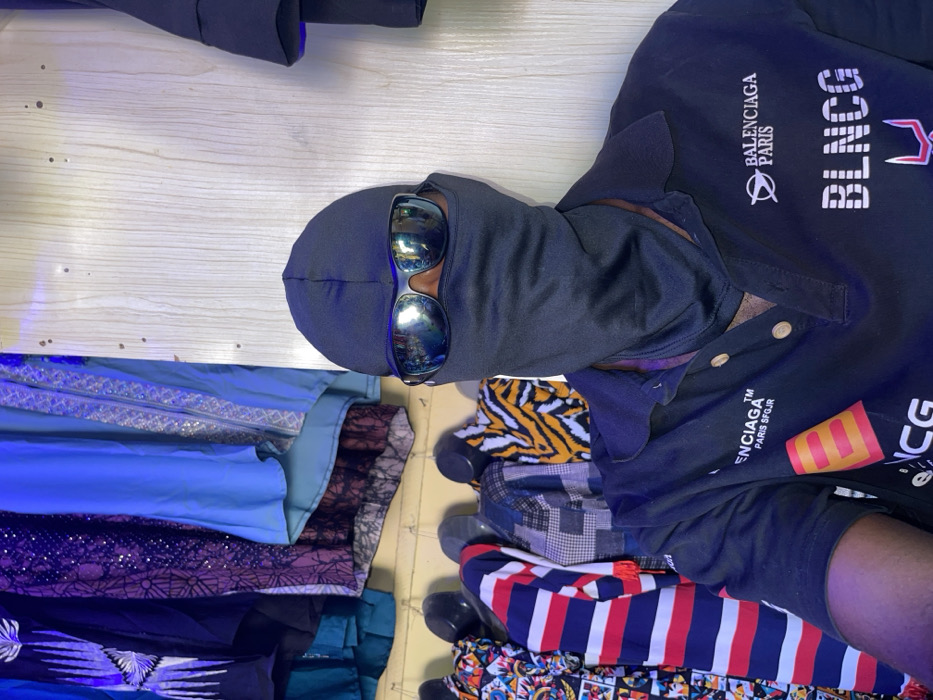 A person wearing a black balaclava and sunglasses lies on a surface covered with various articles of clothing