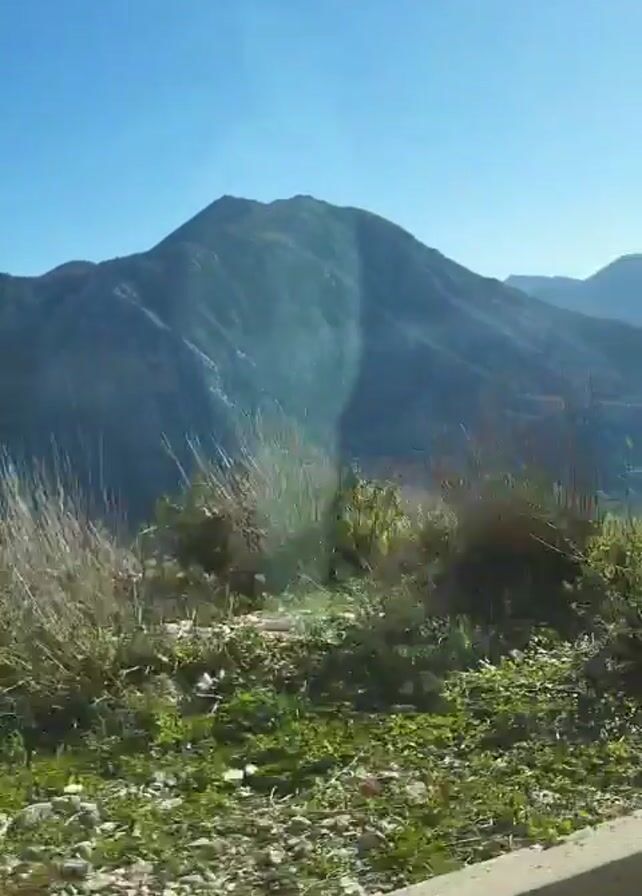 scenic view from a high vantage point. In the foreground, there is a concrete barrier and some greenery. Beyond that, a town nestled along the shore of a bay or fjord is visible. A large mountain dominates the background of the scene. The sky is a clear, bright blue, with the sun shining, though partially obscured by a cloud or haze. The camera appears to be moving slowly. The colors are vivid and the lighting is strong, indicating a sunny day. The perspective suggests the video was taken from a vehicle or a high-altitude location. There are two people speaking in the background.