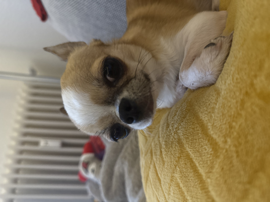 A fawn and white short-haired Chihuahua is depicted in a close-up, indoor setting. The dog lies on a bright yellow, textured fleece blanket or cushion, facing forward with a slight head tilt. Its dark, prominent eyes are open, and its front paws are tucked beneath it, showing visible dark claws on one paw. The background, out of focus, reveals a white vertical panel radiator on the left and a grey fabric sofa or bedding on the right, with a blurred red object partially visible behind it. No visual indicators are present to determine a specific city location such as Berlin, Germany.