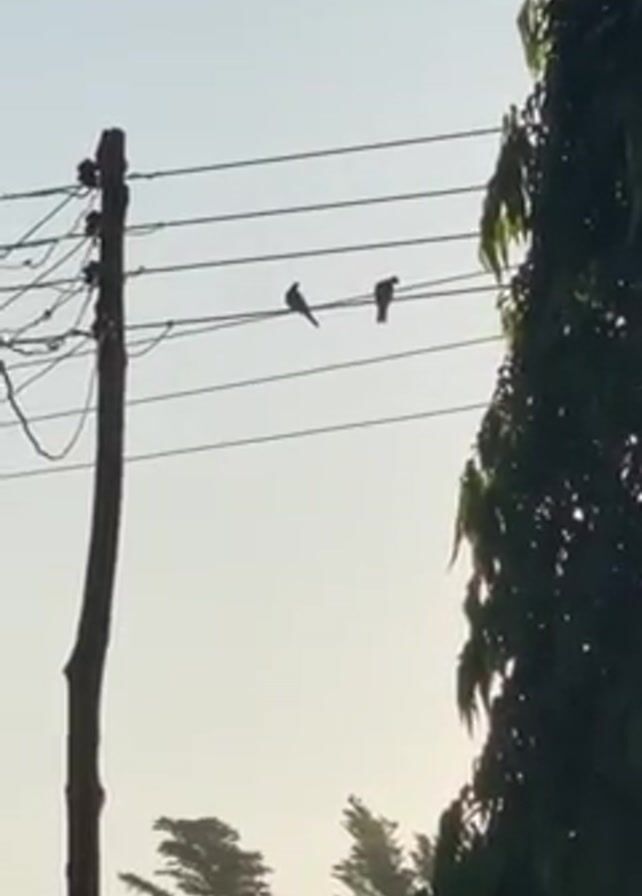 two birds sitting on a power line. The sky is a pale blue, and there is a tall tree to the right of the power lines. A telephone pole is on the left.