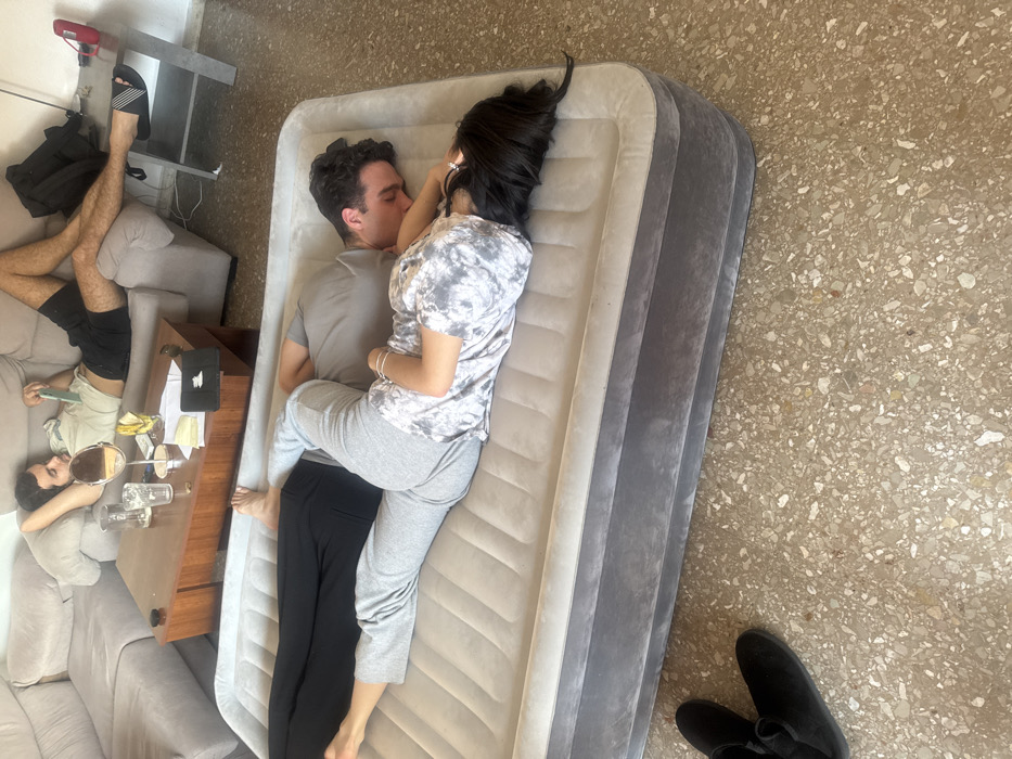 The scene depicts an interior living space in a residence in Valencia, Spain, occupied by four individuals. In the foreground, a grey inflatable air mattress rests on a light-colored terrazzo floor. Two individuals are lying prone on the mattress, facing each other in an embrace. One individual, with dark hair, wears a grey and white tie-dye top and grey sweatpants, with an arm extended around the second individual. The second individual, wearing a grey t-shirt and grey sweatpants, also has an arm around the first; their faces are in close proximity. To the left of the mattress on the floor, a pair of black ankle boots are visible. In the background, a light grey sectional sofa is positioned. Two additional individuals are reclining on the sofa. The individual on the left, wearing a light-colored t-shirt and dark shorts, is leaning back with hands behind their head, holding a green object. The individual on the right, also in a light-colored t-shirt and dark shorts, has their left foot, clad in a black and white slide, resting on a small grey metal side table. A dark wooden coffee table is situated in front of the sofa, displaying multiple glasses, a small round mirror, a yellow fruit, and a black rectangular object. The room is brightly lit, likely by natural daylight.