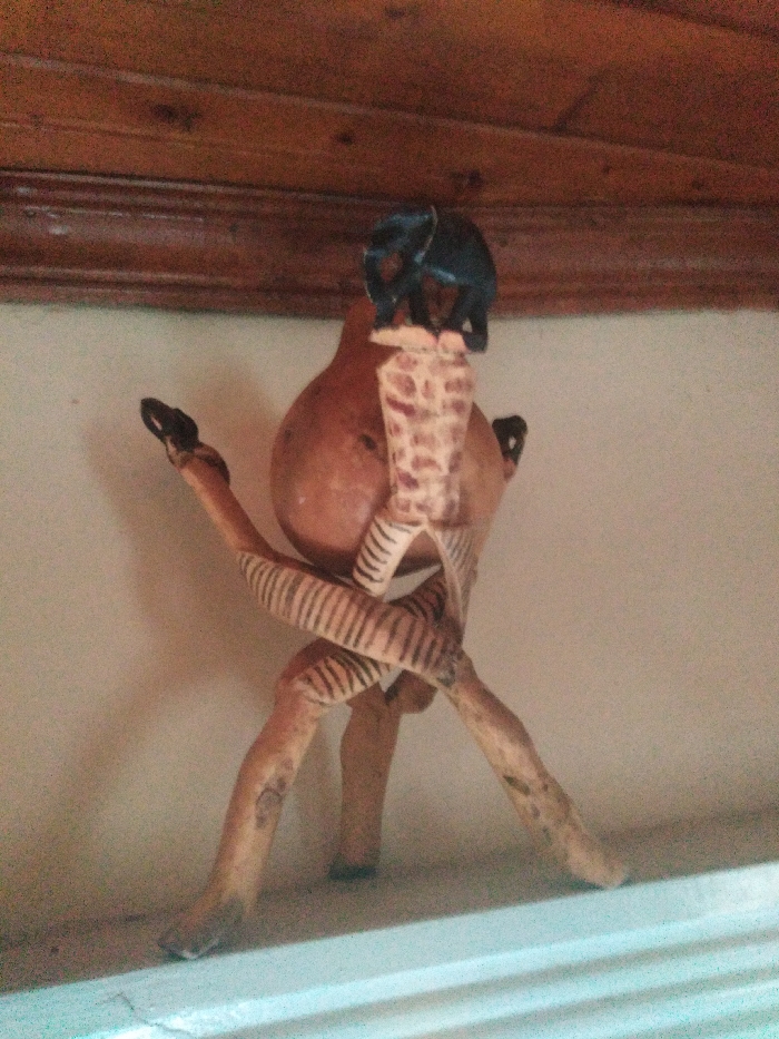 - "A carved, wooden sculpture of an animal with striped legs supporting an ovoid form, possibly a gourd" by FM-15Ydd2, licensed under CC BY 4.0