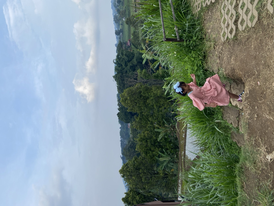 A young girl is shown walking uphill on a dirt path in a rural landscape near Tamiajeng, Indonesia