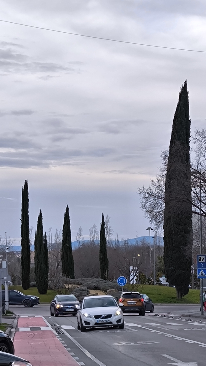 A street scene reveals a line of tall, dark green cypress trees against a backdrop of a cloudy sky. Several cars are traveling on the road, including a white Volvo in the foreground. The road has a red and white striped crosswalk. A roundabout with a blue and white sign is visible, along with other street signs. A glimpse of distant mountains adds depth to the composition.