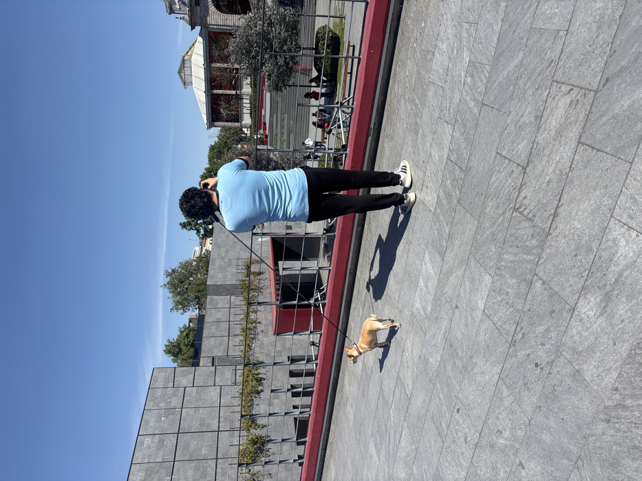 - "A man in a light blue shirt and black pants walks a small tan dog on a leash across a paved area" by FM-H12MK2, licensed under CC BY 4.0