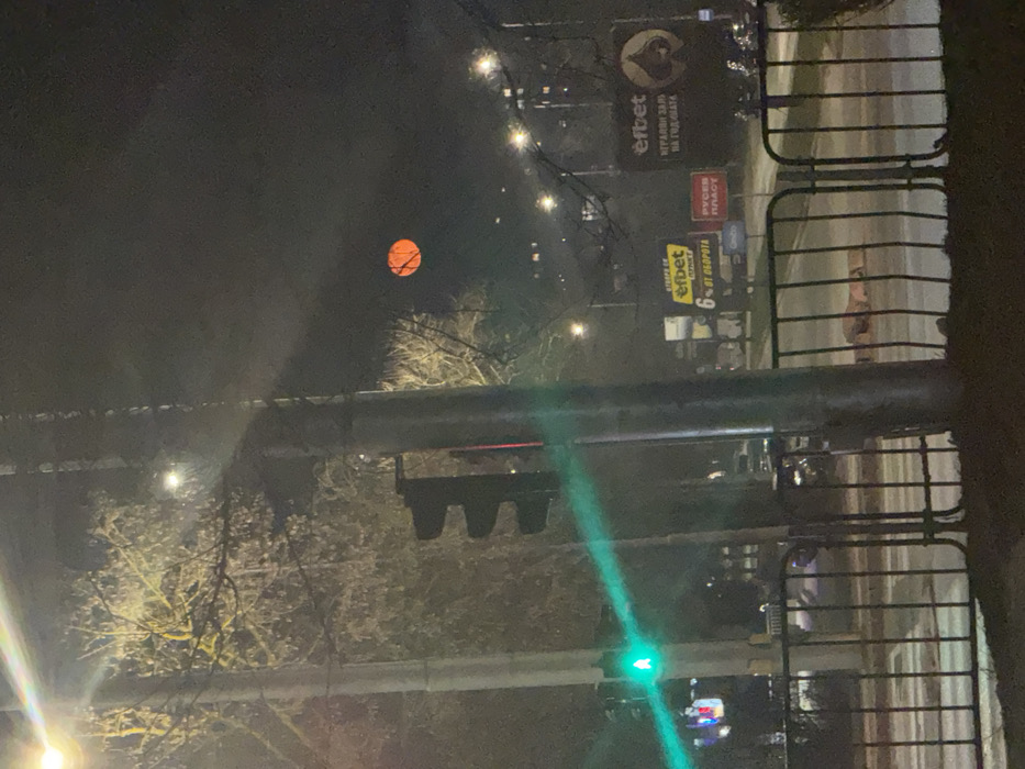 The image displays a nighttime urban street scene in Dobrich, Bulgaria, located near the Rusenski Plaz area, identifiable by "efbet" billboards on 25th September Boulevard. In the immediate foreground, a dark metal barrier or fence extends horizontally, partially obscuring the view. A utility pole stands prominently in the center, and to its left, a traffic light shows a green signal, projecting a diagonal green light beam across the lower left portion of the frame. In the midground, a multi-lane asphalt road is visible, marked with white pedestrian crossing stripes. A dark-clothed figure is observed lying prone on the pedestrian crossing, positioned between the utility pole and the foreground fence, with their body oriented horizontally across the stripes. Several vehicles, some with illuminated headlights, are present on the roadway, primarily in the left lanes. On the far side of the street, multiple billboards are illuminated. Two prominent "efbet" billboards are visible: one features a large black spade symbol and the text "ИГРАЛНА ЗАЛА НА ГОДИНАТА" (Gaming Hall of the Year), while another reads "6 ОТ ОБОРОТА" (6% of turnover), with a smaller sign below it likely indicating "РУСЕНСКИ ПЛАЗ." The background features trees, many with bare branches, and distant residential buildings illuminated by various streetlights. High in the dark sky, a large, bright orange circular celestial object, consistent with the appearance of the moon, is visible to the right. The scene is illuminated by multiple artificial light sources, creating scattered lens flares.