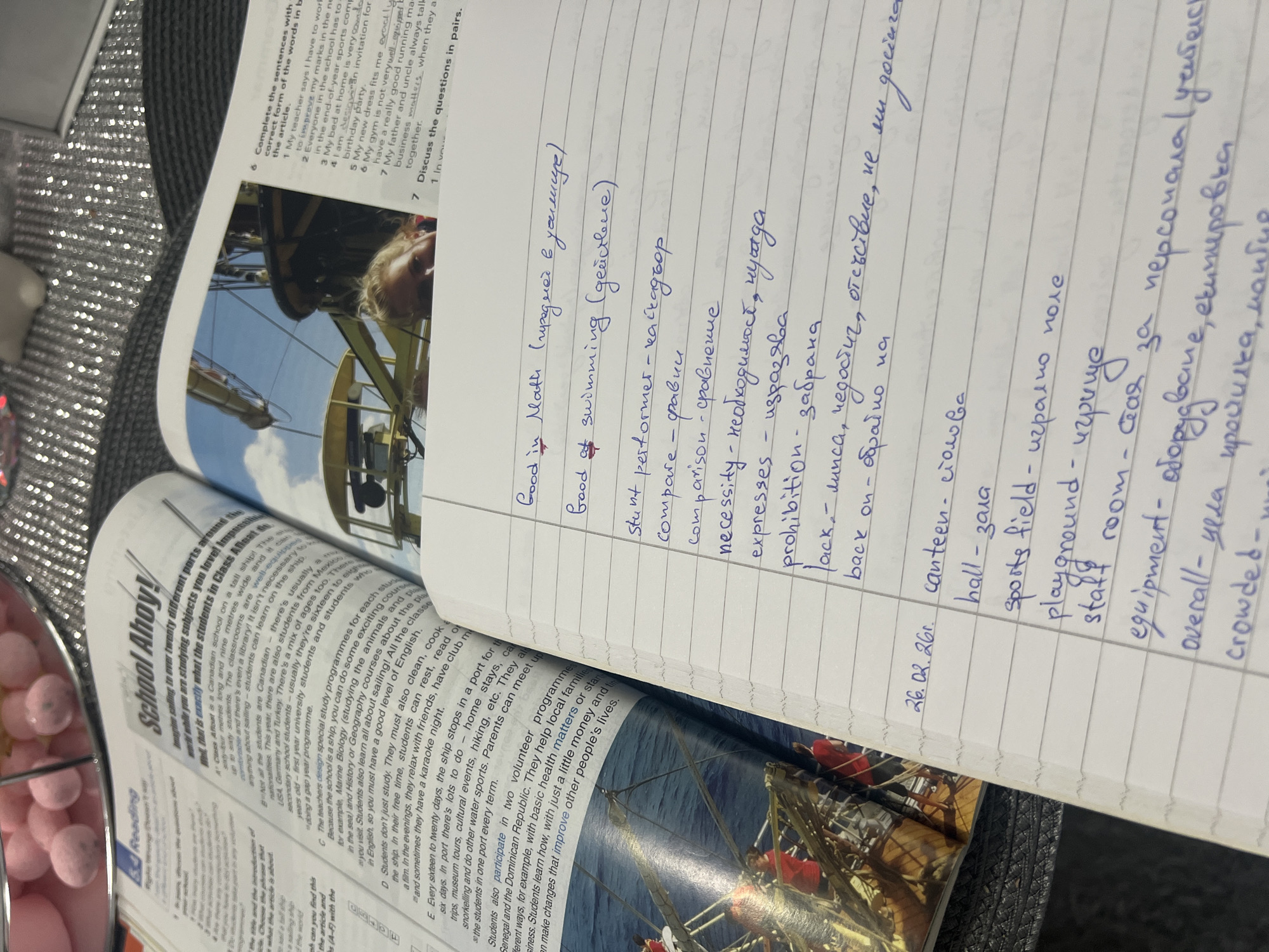 An overhead, slightly angled photograph displays an open English language textbook and a lined notebook placed on a flat surface in Blagoevgrad, Bulgaria. The textbook's visible left page presents a "Reading" section featuring an article titled "School Ahoy!" about a Canadian sailing school. The right page shows a continuation of the article text and comprehension questions. An image on the textbook's right page is partially visible, showing the upper portion of a blonde individual's head with light hair, looking upwards, set against a blue sky and parts of a ship's yellow rigging. Another image on the lower left page depicts several individuals wearing red shirts on a ship's wooden deck. Adjacent to the textbook, a white, lined notebook contains handwritten notes in blue ink. The notes consist of English words and phrases paired with their Cyrillic (Bulgarian) translations or definitions. Examples include "Good in Math (прагней в училище)," "stunt performer - каскадьор," and "necessity - необходимост, нужда." A date, "26.02.26г.," is inscribed above a list of English words translated into Bulgarian, such as "canteen - столова," "hall - зала," "sports field - игрално поле," "playground - игрище," "staff room - стая за персонала (учители)," "equipment - оборудване, екипировка," "overall - цяла проява, мач," and "crowded - препълнен." In the upper left background, several pink, spherical objects are contained within a metallic mesh basket, positioned on a shiny, textured, gray surface. No direct human interaction with the study materials is visible.