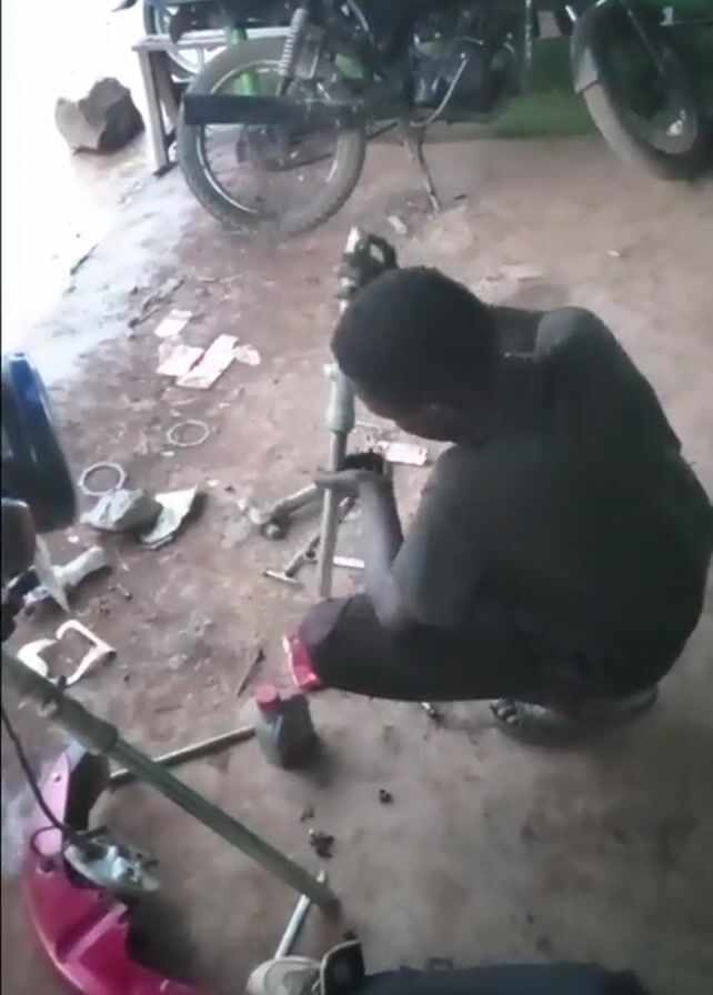 - "A man is squatting on the floor in an open-air garage, repairing a motorcycle fork" by FM-wUCBi2, licensed under CC BY 4.0
