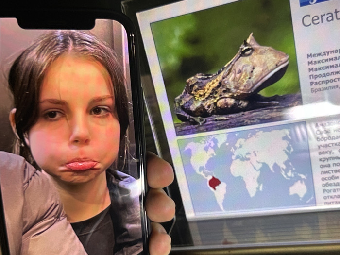The image depicts an indoor scene where a black smartphone is held and positioned next to an illuminated informational display. The specific location within Novosergievka, Russia, cannot be determined from the visual evidence. The smartphone screen displays the head and upper torso of a young female with medium-length dark hair. She has a fair complexion, dark eyes, and a pouting expression with her cheeks puffed out and lips pursed. The subject wears dark clothing under a light-colored garment, possibly a jacket. The smartphone is held by a hand, visible on its right side, with fingers partially obscuring the phone's edge. Adjacent to the smartphone, on the right side of the frame, is an informational display board. The top portion of the display shows a close-up photograph of a horned frog, identifiable by its distinct pointed protuberances above the eyes, with brown and tan camouflage patterns, resting on a log or branch against a blurred green background. Above the frog image, partially visible Russian text includes "Cerat" likely referring to the genus *Ceratophrys*. Below the frog image, a world map is displayed, with a region in South America (specifically, parts of Brazil, Peru, and Bolivia in the Amazon basin) highlighted in red. Russian text describing the frog is visible to the right of the images. The environment suggests an educational or exhibition setting, such as a museum or zoo, characterized by artificial lighting.