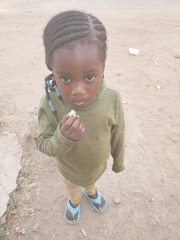 A young Black child, facing the camera, stands on a dirt surface. The child has braided hair with decorative beads. They wear a high-necked, long-sleeved green sweater, light brown pants, and blue flip-flops. The child holds a small, white object in their hand, partially protruding their tongue. Debris and a concrete edge are scattered around the child.