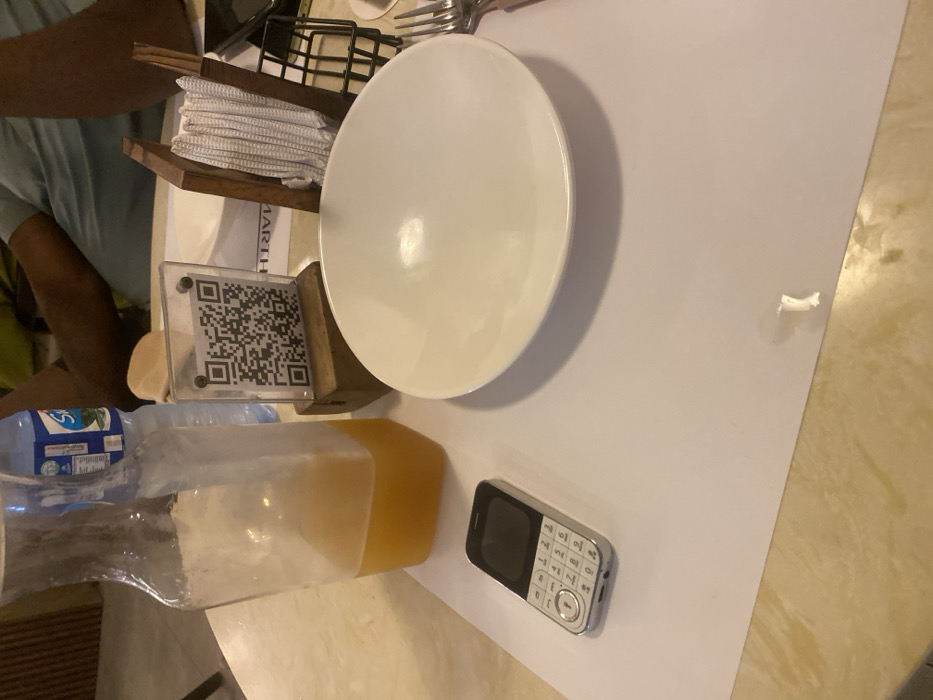 This image captures a close-up view of a table setting in a restaurant or cafe located in Links Reservation, Nigeria. The scene shows a light-colored table surface partially covered by a white paper placemat. On the left, a clear glass carafe contains an orange-colored liquid, approximately one-quarter full, next to a plastic bottle of "Safi" branded water. A small, silver-toned feature phone with a visible keypad and dark screen lies horizontally on the placemat. Centrally positioned is a clear acrylic stand holding a QR code, mounted on a small wooden block. To its right, a large, white, shallow bowl rests on the placemat. Further right, a wooden napkin holder contains several folded white napkins, adjacent to a collection of metal cutlery including forks and knives. A black wire basket is partially visible behind the napkin holder. In the upper background, the dark-skinned arm and leg of an individual wearing light-colored clothing are visible, indicating the presence of a person seated at the table. The background is softly blurred, suggesting an indoor environment with ambient lighting.