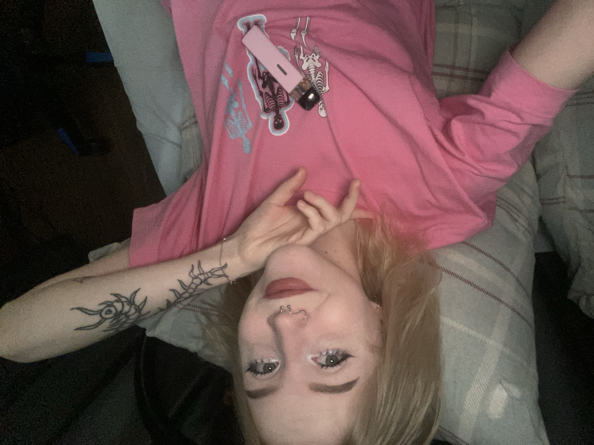 A person is lying down, viewed from an overhead perspective. The person has fair skin, blonde hair, and red lipstick. They are wearing a pink t-shirt with light blue graphics of skeletons. A pink vaping device is on the shirt, lying across the skeleton graphics. The person's left arm, visible in the lower left, has multiple black tattoos. The person is lying on a gray and white plaid pillow. Dark areas surround the pillow and the person, indicating the setting is dimly lit. The location is unknown and there is no evidence it is in Izhevsk, Russia.