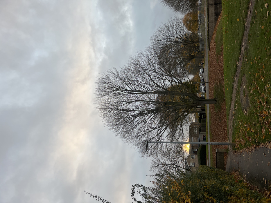 The image depicts a late autumn or early winter scene in a residential area of Stevenage, United Kingdom