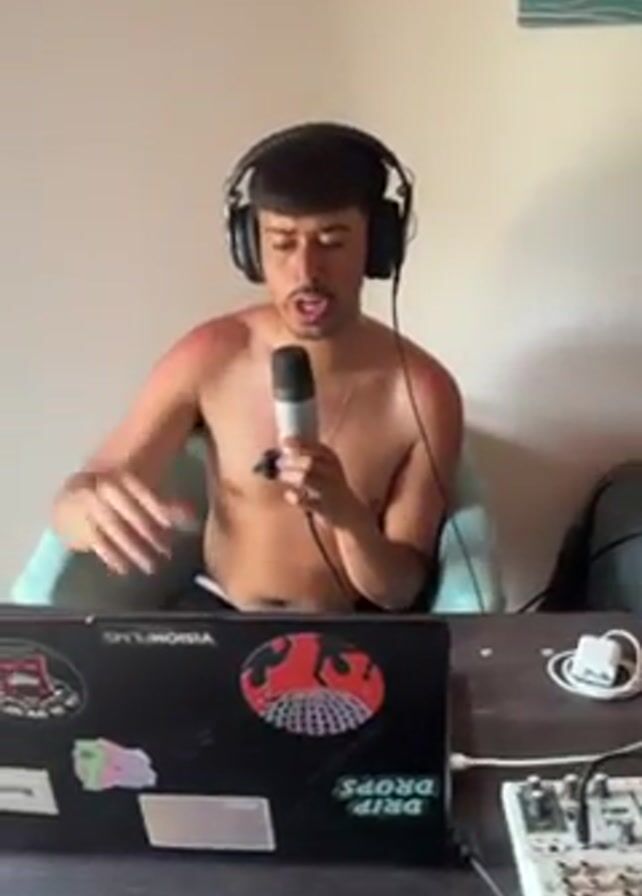 Here is a detailed description of the video: The video features a shirtless man wearing headphones and singing into a microphone