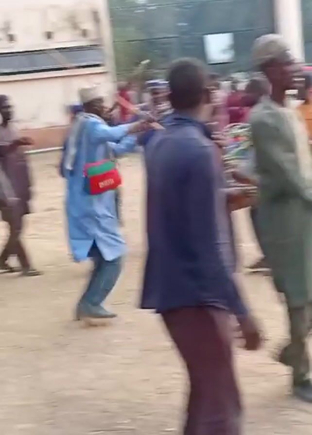 group of people in what appears to be an outdoor gathering or procession. Many are dressed in traditional or colorful clothing. Several individuals are carrying long sticks or wooden poles and raising them in the air. One person is carrying and playing a drum. The group is walking on what looks like a dirt or sand-covered ground. In the background, there's a building with a glass facade and some trees. The overall scene suggests a cultural celebration or performance.