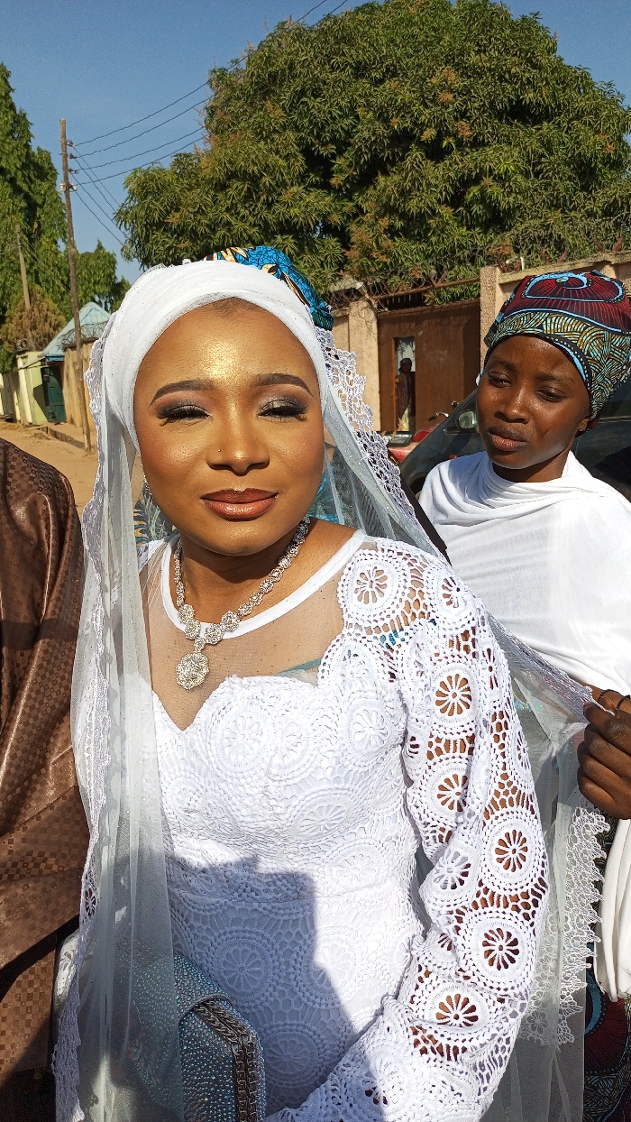 The image displays an outdoor scene in Afaka, Nigeria, during daylight, featuring three individuals. The central figure is a woman with dark skin, facing slightly left of the camera, looking forward with a slight smile and partially closed eyes. She has a nose piercing and wears full makeup, including defined eyebrows, eyeshadow, and lip color. Her head is covered with a white hijab over a blue-patterned under-cap, from which a sheer white veil drapes over her shoulders. She wears a long-sleeved white lace dress with a round, open-work pattern and a prominent silver-toned necklace with a large, ornate central pendant. Her left hand holds a sparkling silver clutch purse. To the right and slightly behind the central figure, a second woman with dark skin is visible, wearing a multi-patterned headwrap and a white garment. Her right hand is extended towards the central figure's veil, appearing to adjust or hold it. A third individual, partially visible on the far left, wears a brown patterned garment. The background consists of a residential setting with light-colored building walls. A utility pole with wires is visible on the left. On the right, a darker-colored gate or door is set within a wall, with a blurred figure standing inside the doorway. A dark vehicle is partially visible behind the individuals. Large green trees and a clear blue sky are present in the upper background. Barbed wire is affixed to the top of a wall section in the background.