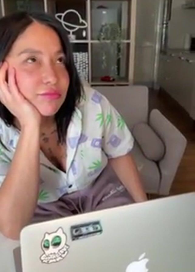 A woman sits at a table with a laptop in front of her. She rests her head on her hand and looks bored, but when someone dangles a green stretchy toy in front of her, she smiles and grabs at it. She then puts the toy on her face while music plays in the background. The woman is wearing a short-sleeved collared shirt with marijuana leaf patterns and sweatpants. The laptop is grey with an Apple logo and stickers. The room has a grey chair, white shelves, and a glimpse of a kitchen.