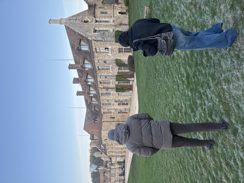 Two people stand on a grassy lawn in front of a large, historic stone building. The building is several stories high with many windows and a pitched roof. One person wears a dark jacket and blue jeans, while the other is dressed in a gray puffer coat and dark pants. The grass appears slightly frosty or damp. The sky is a clear blue.