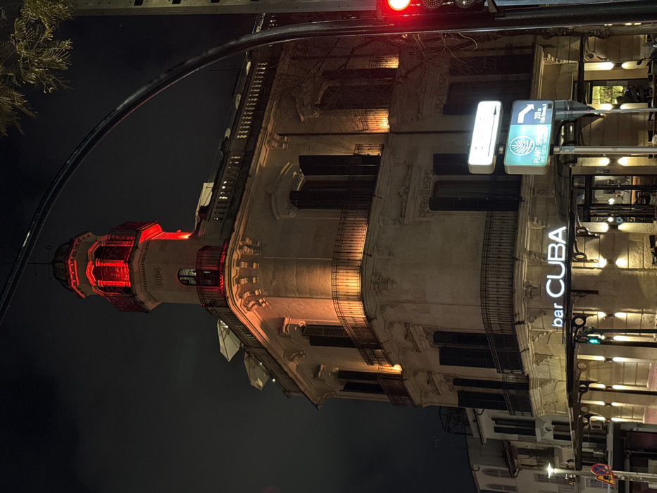 The image depicts the exterior of a multi-story, ornate building at night, located on Avinguda d'Argentina, 9, in Palma, Spain. The building features a prominent corner turret, illuminated with vivid red light on its upper section, topped with a small dome and finial. The building's light-colored stone facade is illuminated by warm, golden-orange upward-facing lights, highlighting architectural details and multiple balconies with dark iron railings. Dark shutters cover most windows. On the ground floor, a large, illuminated sign displays "bar CUBA" in white lettering. Below the sign, an awning extends over outdoor seating, and interior lighting reveals indistinct figures seated within the bar through glass windows. A rooftop terrace is visible with several white patio umbrellas. On the right side of the frame, a dark, curved street lamp arm partially obscures the building. A traffic light showing a red signal is visible on the right, and a smaller green traffic light is visible near the bar entrance. Below the red traffic light, a street sign pole supports a rectangular green and white sign with a palm tree logo, displaying "PLANT 250m" and an arrow pointing right with additional text "Cala Fornells, 8". A segment of a palm tree frond is visible in the upper right, and bare tree branches are discernible against the building's facade on the right. The sky is dark and overcast. Less illuminated buildings are visible on the left side of the frame.