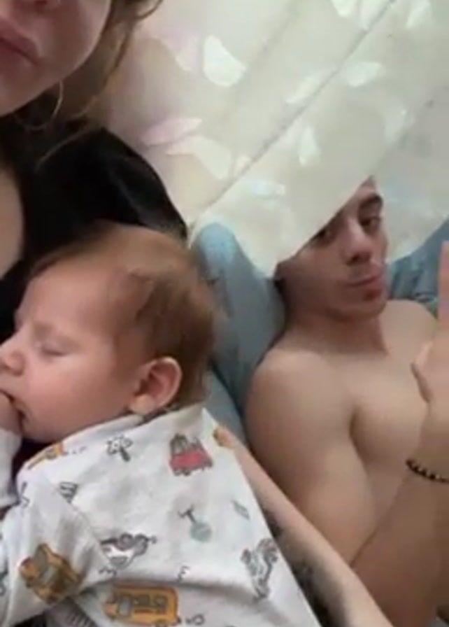 three people in bed. A woman with light skin and light brown hair, wearing a black shirt and gold jewelry, appears to be holding a sleeping baby with light hair who is wearing a patterned onesie. Beside them, a man with light skin, short dark hair, and no shirt is lying on the bed. He is holding a phone and initially makes a peace sign with his fingers towards the camera. The woman touches his chest. The background includes a light blue pillow and a patterned sheer curtain.
