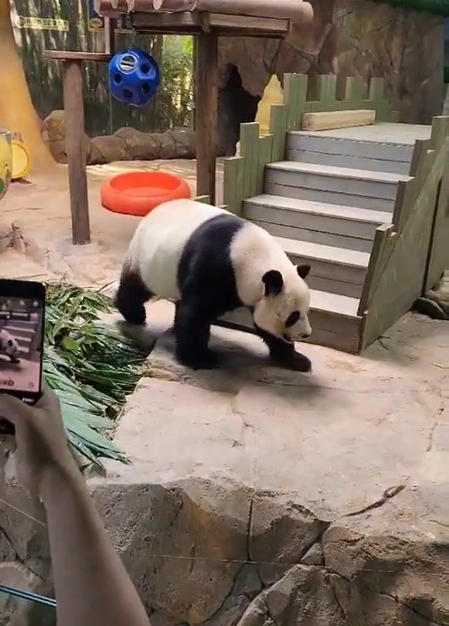 panda walking in an indoor enclosure at what appears to be a zoo or animal park. The panda is black and white, with its back to the camera initially, and it moves to the right across a rocky surface. The enclosure has a wooden structure with stairs, a blue hanging toy, and some bamboo. In the background, there's a painted mural depicting mountains and vegetation, and people can be seen observing the panda from behind a railing. A person is visible on the left side of the frame, holding a phone and filming the panda.