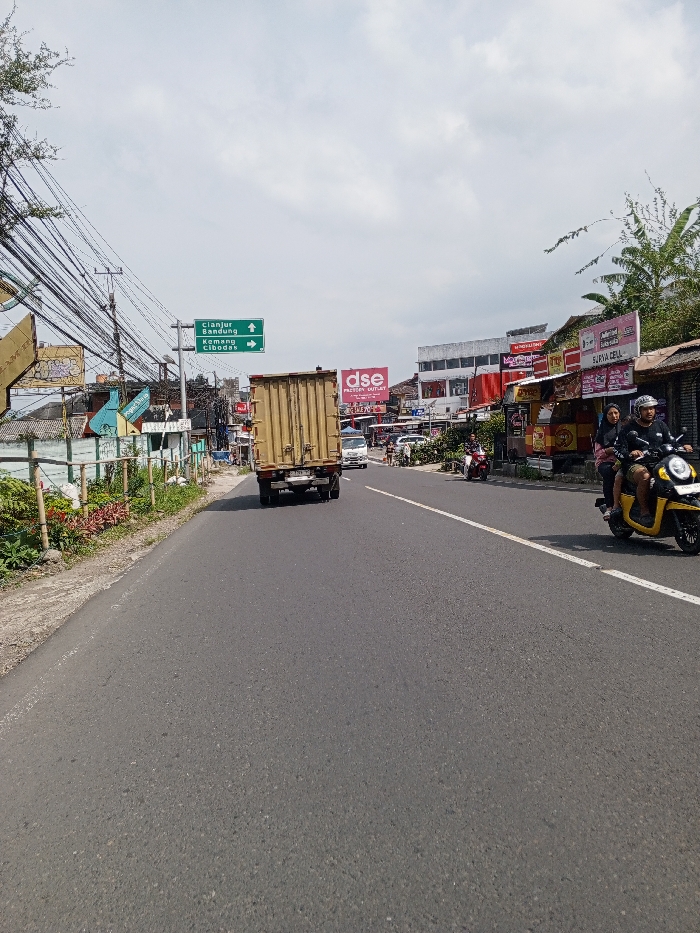 The image depicts a two-lane asphalt road on an overcast day. The location is indicated by a green street sign showing "Cianjur Bandung" with an upward arrow and "Kemang Cibodas" with a rightward arrow, identifying the scene as being in **Indonesia**, not Multhan, India. A beige box truck, bearing a rear license plate with "F 9170 FB", travels away from the viewer in the left lane. Behind it, a white pickup truck is partially visible. In the right lane, two individuals on a yellow scooter with a white front panel travel towards the viewer; the driver wears a helmet, the passenger does not. Further down the right lane, a single rider on a red scooter also travels towards the viewer. The left side of the road features a dirt shoulder, low-lying vegetation, a light-colored metal barrier, and numerous utility poles laden with black wires. The right side of the road is lined with commercial buildings displaying various signs, including a prominent red "dse FACTORY OUTLET" billboard and a smaller "SURYA CELL" sign. Trees and additional structures are visible in the background on both sides of the road. The sky is largely covered by clouds.