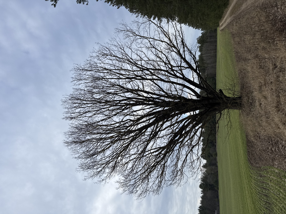 The image presents an outdoor rural landscape in Капцёўскі сельскі Савет, Belarus, under an overcast sky. A large, dark-trunked deciduous tree, completely bare of foliage, stands centrally in the foreground, its intricate network of branches silhouetted against the sky. To the immediate left of the tree, a vibrant green field with distinct parallel crop rows stretches into the midground. Adjacent to the tree's base on the right, and extending into the midground, is a light brown dirt path or unpaved road. The ground around the tree and along the path consists of dry, light brown grasses and earth. In the background, a dense treeline composed of dark green coniferous and lighter deciduous trees spans the horizon. A thick stand of dark green coniferous trees borders the right side of the path and the image frame. The sky is uniformly overcast with light grey clouds. No human figures, animals, or specific actions are visible within the scene.