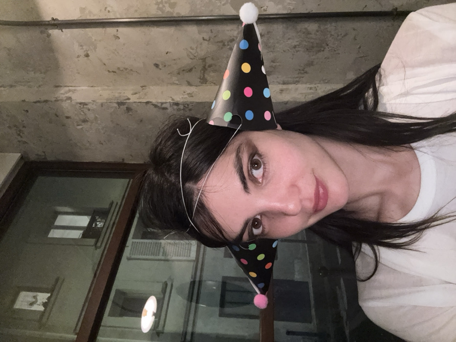 A young adult female is centered in the frame, indoors, looking directly at the camera. She has dark hair, styled with some volume on top and strands framing her face, and wears a light-colored top. She has a slight smile and is wearing a party headband featuring two small, black, conical party hats adorned with multicolored polka dots and small pom-poms (pink on the left, white on the right). To her left, a window provides a view of a dimly lit urban environment, indicative of nighttime. Through the window, a light-colored building facade with multiple windows, some illuminated and others dark, is visible. The architectural style, including partially visible balcony details and window shutters, is characteristic of Haussmannian buildings in Paris, France. A circular light reflection is present on the window glass on the left. To the right of the subject, an interior wall with a distressed, textured, light-grey finish is visible.