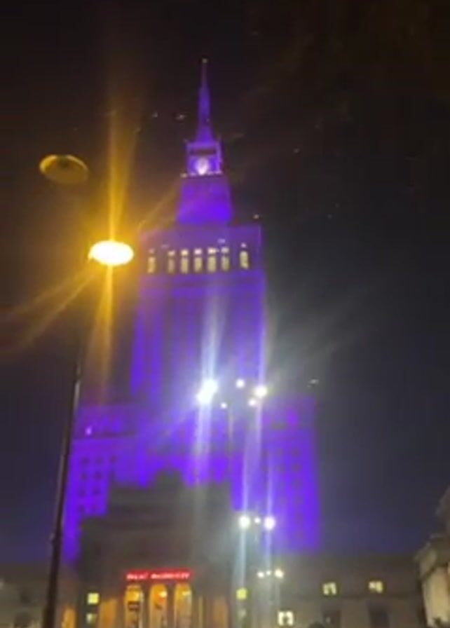 nighttime view of a large building, possibly a skyscraper, illuminated with purple lights