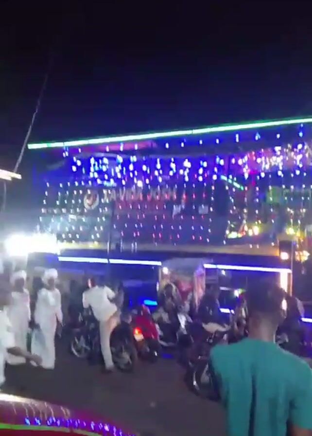 At night, a lively street scene unfolds in front of the camera. People are milling about, with many riding motorcycles. The street is illuminated by bright lights, particularly from a building decorated with multicolored lights, a tall sign, and streetlights. Numerous food vendors set up shop on the sidewalk, with items like buckets, bottles, and covered containers on tables.