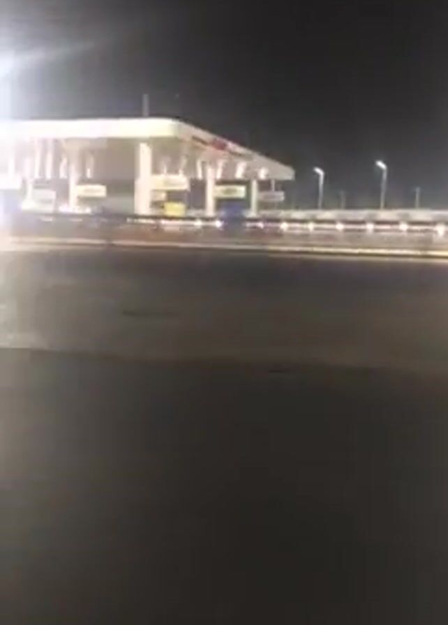 nighttime scene, viewed from a moving vehicle, of what appears to be a toll plaza