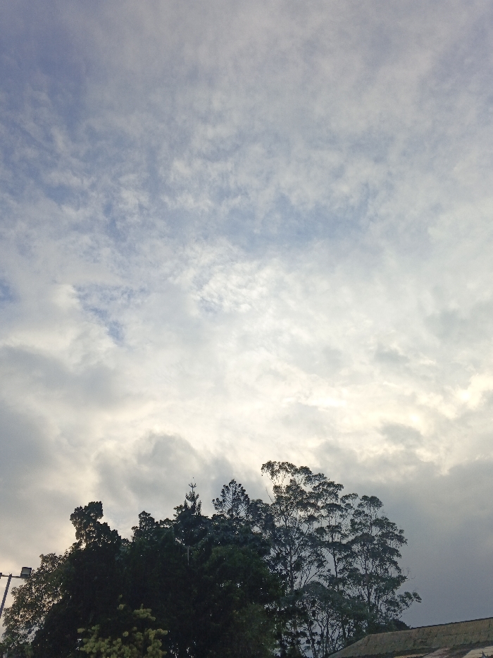The image depicts an outdoor scene in Unknown, Cambodia, predominantly featuring a cloudy sky over a tree line and partial architectural elements. The upper two-thirds of the frame are occupied by an overcast sky with scattered white and light gray clouds, revealing glimpses of blue sky, particularly in the upper-left quadrant. A prominent bright light source, likely the sun, is diffused behind clouds in the lower-middle sky. The lower foreground features a dense canopy of varied trees, silhouetted in dark green and dark grey tones. A distinct tall, slender conifer-like tree is prominent near the center of the tree line. A dark utility pole or street light support is partially visible on the far left, extending upwards from the tree line. A segment of a reddish-brown tiled roof or exposed earthen bank is visible in the bottom-right corner. No individuals or specific actions are discernible.