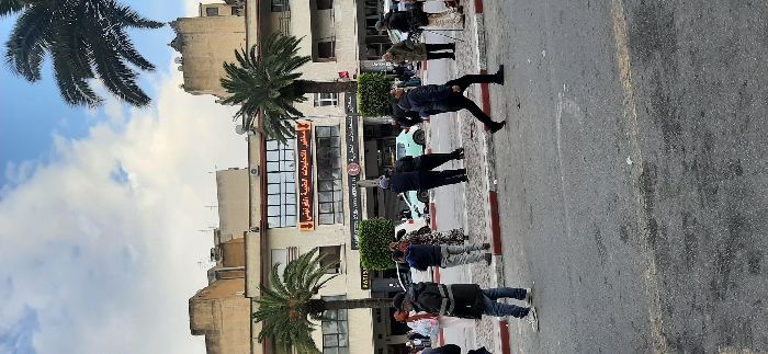 The image depicts a daytime street scene in Agadir, Morocco, specifically near the "El Founti Medical Analysis Laboratory." The background features a multi-story building, light-colored with brown trim, hosting commercial establishments on the ground floor, including a visible "PATISERIE" sign on the left and the "مختبر التحاليل الطبية الفونتي" (El Founti Medical Analysis Laboratory) sign prominently displayed in red and yellow on the first floor. Above this building, older, sand-colored structures with rooftop antennae are visible against a partly cloudy sky with patches of blue. Two large palm trees frame the central building, with smaller green bushes bordering its base. The foreground and midground consist of an asphalt street, marked by a raised red and white concrete curb. Approximately fifteen to twenty individuals, predominantly men, are present on the street and sidewalk area. They are dressed in casual modern attire, including jackets and jeans. Some individuals are standing in groups, while others appear to be walking. A man in the foreground, center-right, is actively striding from right to left in a dark jacket and trousers. On the far right, an older man holds a walking stick. In the midground, two light-colored cars, one possibly light blue or mint green and another white, are visible on the street, either parked or moving slowly.