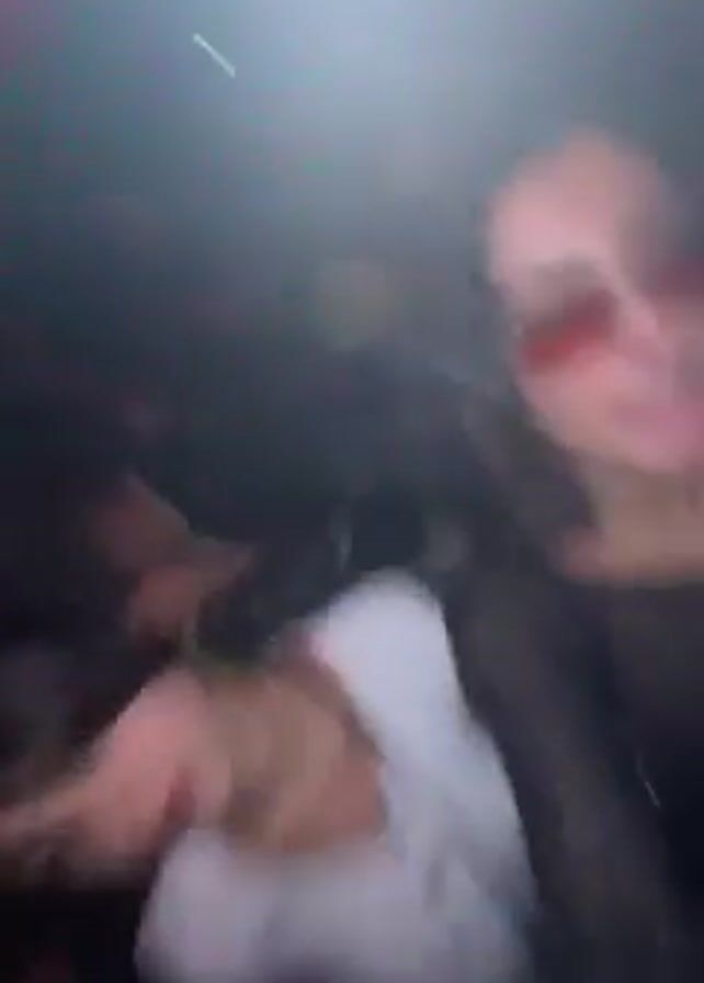 group of people in a dark, smoky club. A woman with long dark hair blows a kiss at the beginning. The camera angle is canted and the view is unstable. People are close together, some wearing white shirts, and they appear to be dancing and enjoying themselves. Red objects, possibly confetti, are seen falling from above. The lighting is dim with occasional flashes.