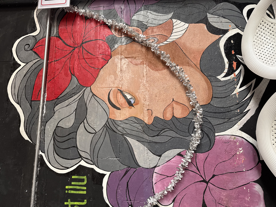 A painted artwork depicts a woman with a flower tucked in her grey and black hair. Her eye is open, and her skin is a tan color. A string of silver tinsel adorns the painting from top left to lower right. She has a large red flower near her left ear and large purple flowers near her lower right. The background is black. Parts of two white hats are in the upper right.