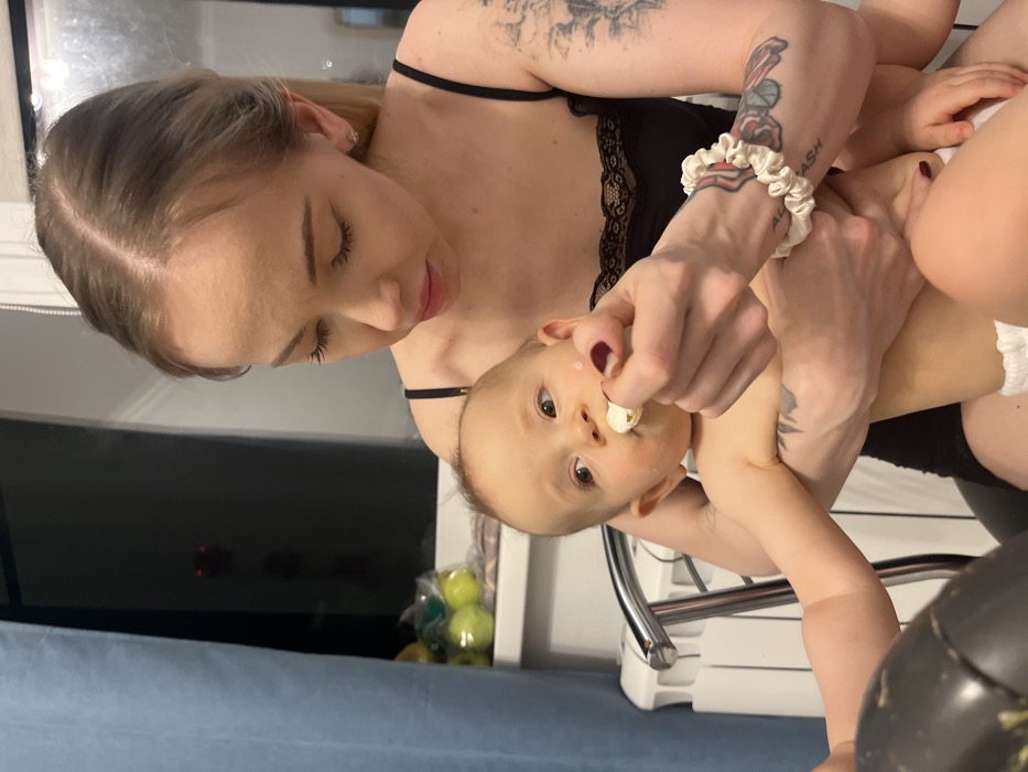 A fair-skinned woman in a black top feeds a light-haired baby with a pacifier. The woman, with multiple tattoos on her arms, uses her left hand to hold the baby while offering food with her right hand. The baby, sitting in a high chair, looks directly at the camera. The setting appears to be inside a home, possibly near a dining area, with a TV screen visible in the background.