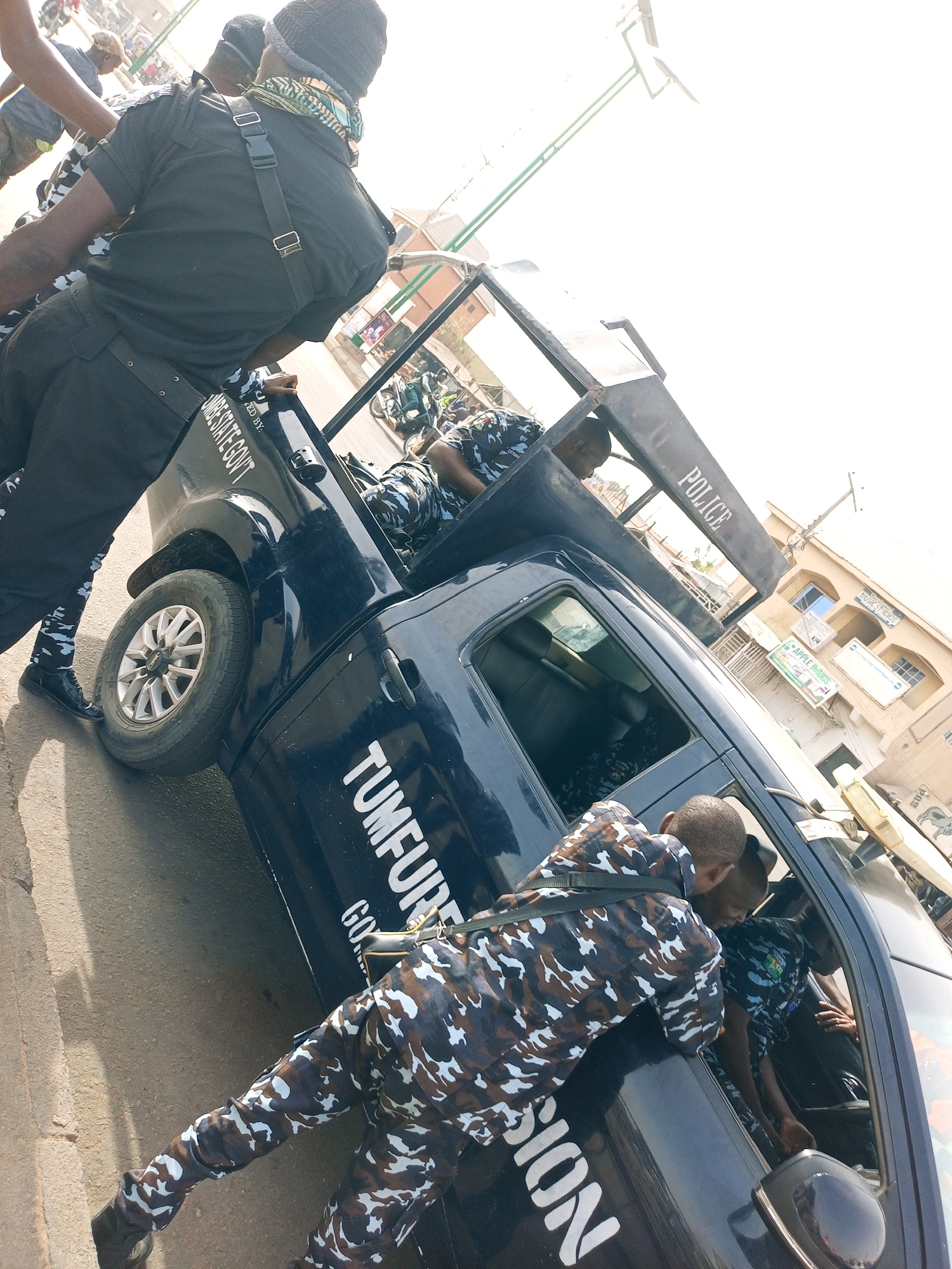 The image depicts a daytime scene on a public street in Gombe, Nigeria, featuring multiple individuals and a dark blue (appearing almost black under bright light) police pick-up truck