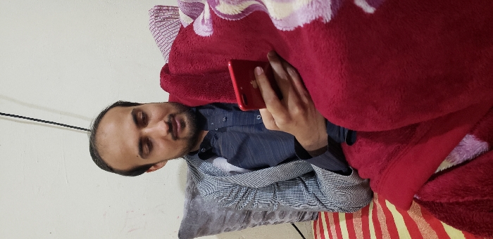An adult male, with dark hair and a beard, is depicted indoors, seated or reclining. He wears a dark blue patterned shirt and a grey and white patterned blazer. A red fleece blanket covers his lower torso and right arm. He holds a red smartphone in his right hand, his gaze directed towards the device. A grey patterned pillow supports his left shoulder, and red and yellow striped bedding is visible to his left. The background consists of a plain, light-colored wall with a black cable extending vertically downwards. The specific location within the city of Kandahar, Afghanistan, cannot be determined from the visual evidence.