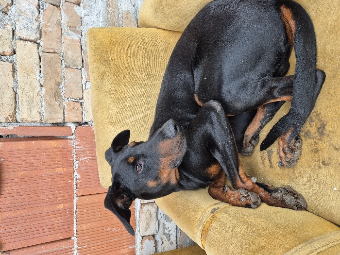 - "A black and tan Doberman Pinscher-type dog is observed resting in a curled position on a mustard yellow upholstered armchair" by FM-8pl8h1, licensed under CC BY 4.0