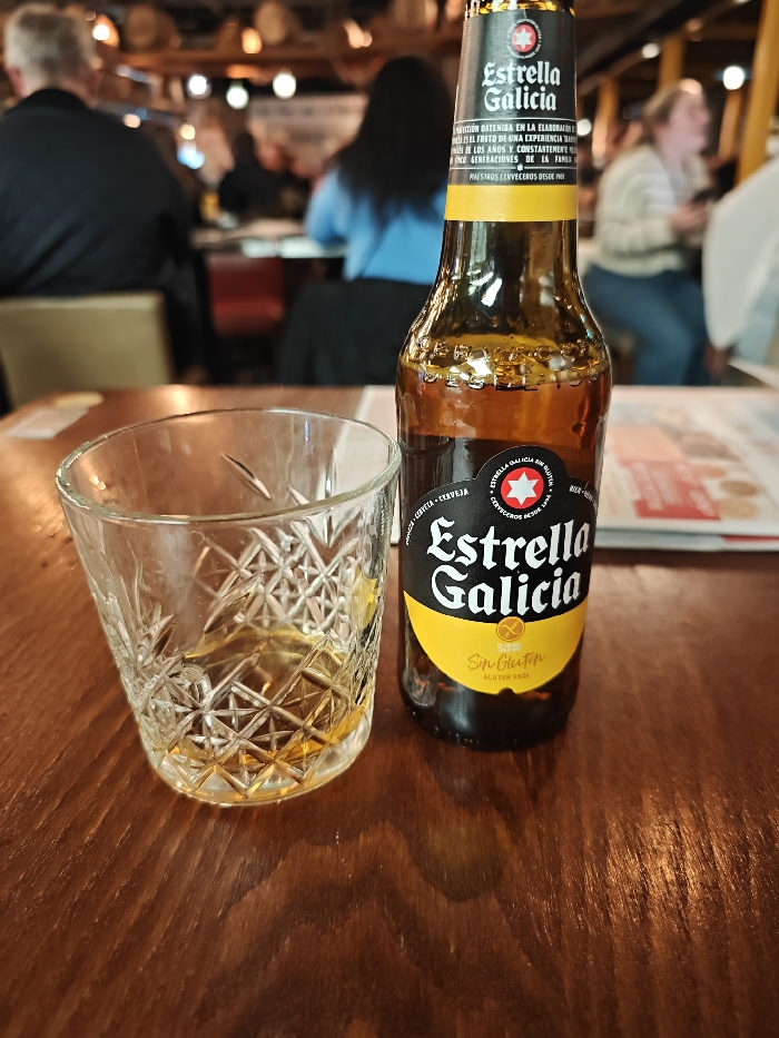 Inside a public establishment in London, United Kingdom, a close-up, eye-level view focuses on a dark brown wooden table. On the left, an empty, clear cut-glass tumbler with a geometric pattern holds a small amber liquid residue. To its right, an upright brown glass bottle of Estrella Galicia beer is visible, displaying its black and yellow label with "Estrella Galicia," "CERVEZA," and "Sin Gluten / Gluten Free" text. Behind these items, a blurred document, likely a menu, with red and white text is partially visible on the table. The background is softly blurred, revealing several unidentifiable patrons seated at tables within a warmly lit interior. One person with dark hair and a blue top faces away from the camera, while another with lighter hair and a striped top is partially visible to the right. The environment suggests a casual bar or restaurant setting with indistinct lighting fixtures above.