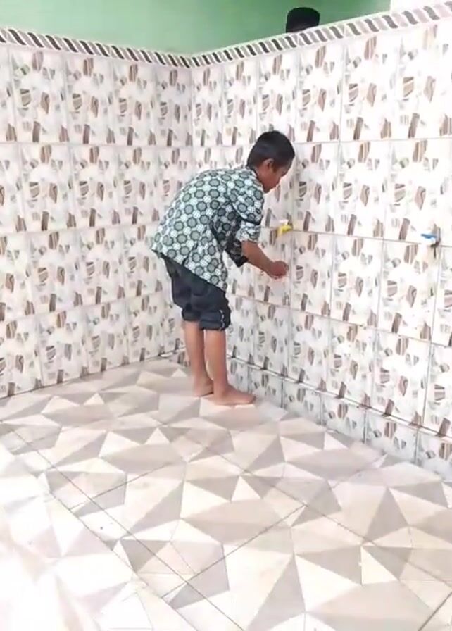 A young person is standing on a tile floor, inside what appears to be a small shower or bathroom, washing their face under a faucet attached to a tiled wall